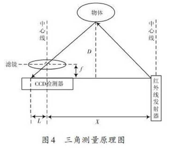 紅外線的應(yīng)用我們并不陌生:從電視、空調(diào)的遙控器,到酒店的自動門,都是利用的紅外線的感應(yīng)原理。而具體到無人機避障上的應(yīng)用,紅外線避障的常見實現(xiàn)方式就是「三角測量原理」。紅外感應(yīng)器包含紅外發(fā)射器與CCD檢測器,紅外線發(fā)射器會發(fā)射紅外線,紅外線在物體上會發(fā)生反射,反射的光線被CCD檢測器接收之后,由于物體的距離D不同,反射角度也會不同,不同的反射角度會產(chǎn)生不同的偏移值L,知道了這些數(shù)據(jù)再經(jīng)過計算,就能得出物體的距離了,如下圖所示。