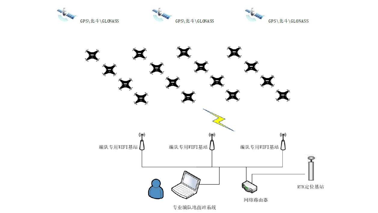 無人機(jī)編隊(duì)采用大規(guī)模WIFI連接實(shí)現(xiàn)數(shù)據(jù)鏈路,無人機(jī)通過GPS/RTK 等衛(wèi)星定位技術(shù)確定自身位置,地面控制系統(tǒng)有一套智能高效的無人機(jī)編隊(duì)遠(yuǎn)程操控系統(tǒng),同一時(shí)間告訴每一架飛機(jī)位置在哪、往哪里飛、隊(duì)列如何切換等。