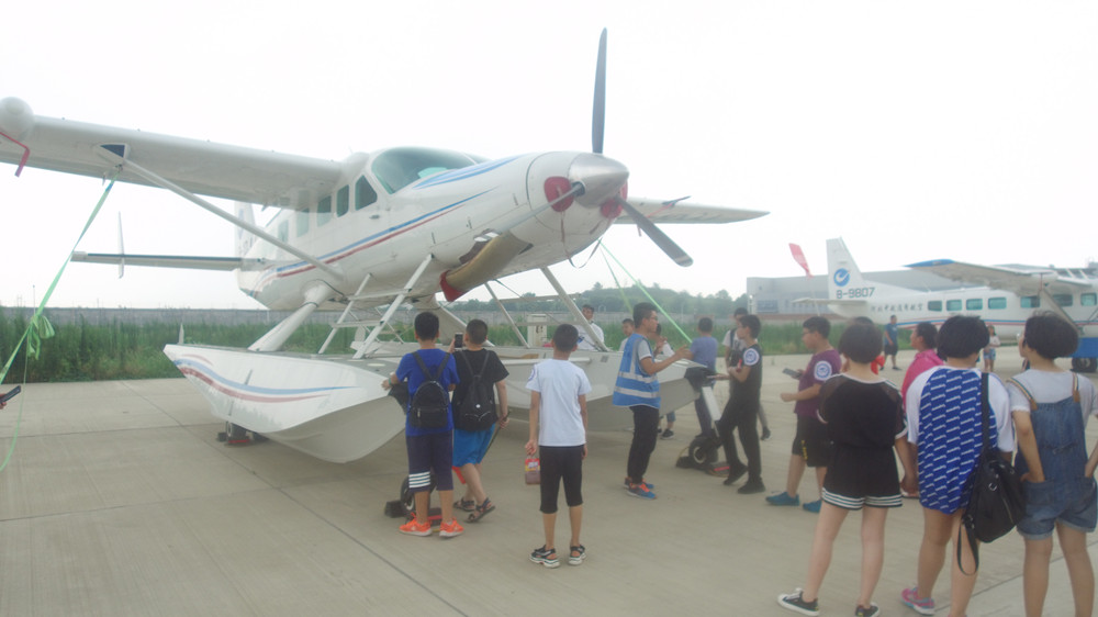 室外的停機坪上停放著數(shù)十架各式各樣的通用航空飛機,大家在停機坪上與飛機合影,水陸兩用飛機吸引了不少孩子的好奇心。